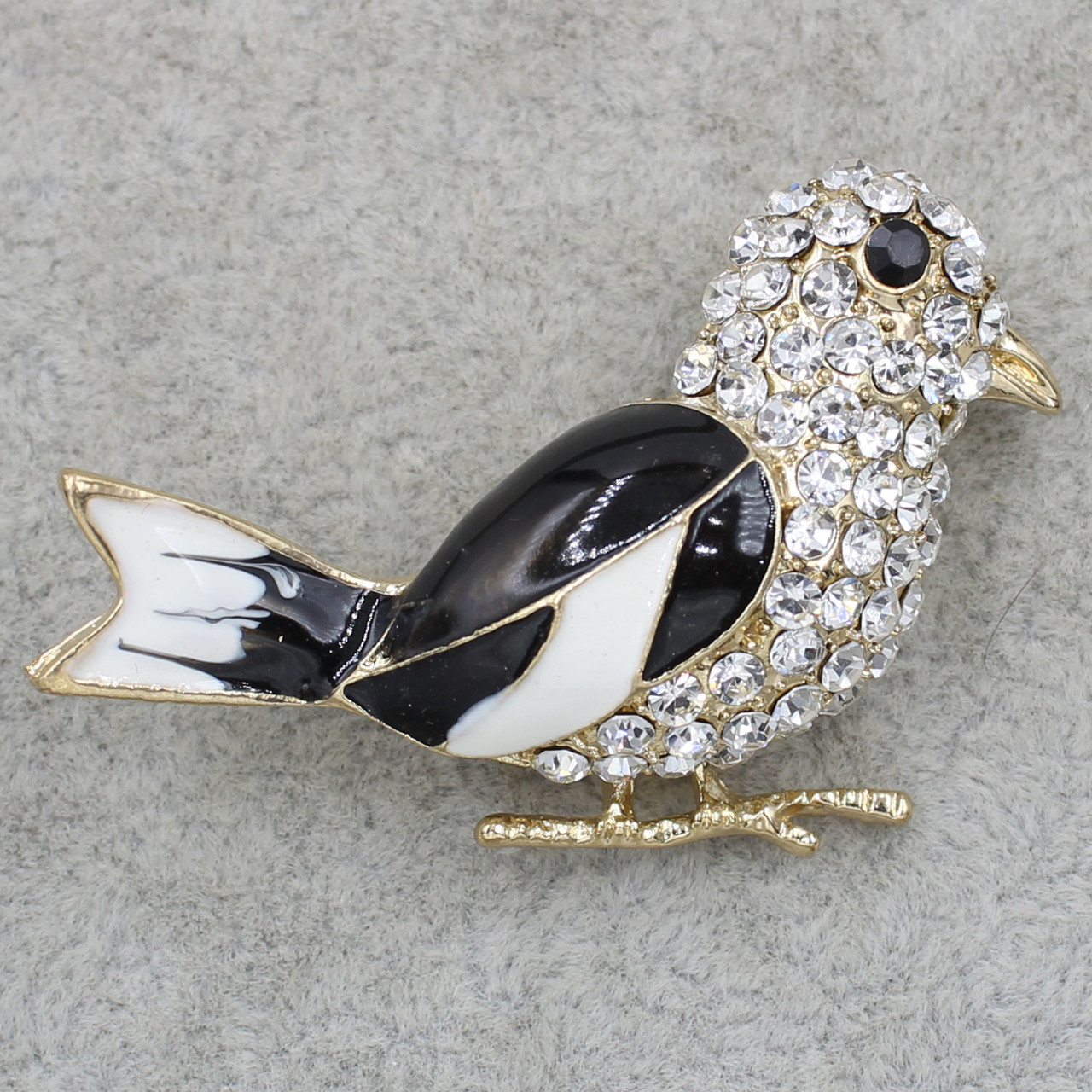 Брошка металева золотиста Пташка зі стразами покрита кольоровою емаллю розмір виробу 40х30 мм