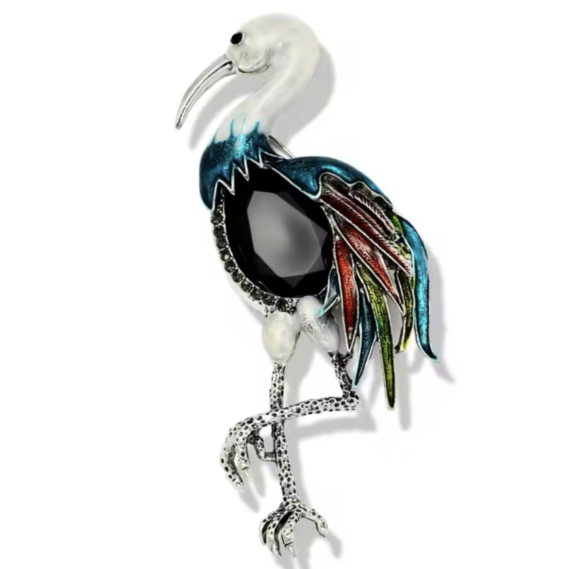 Брошка металева срібляста Цапля з чорним агатом покрита кольоровою емаллю розмір виробу 100х50 мм