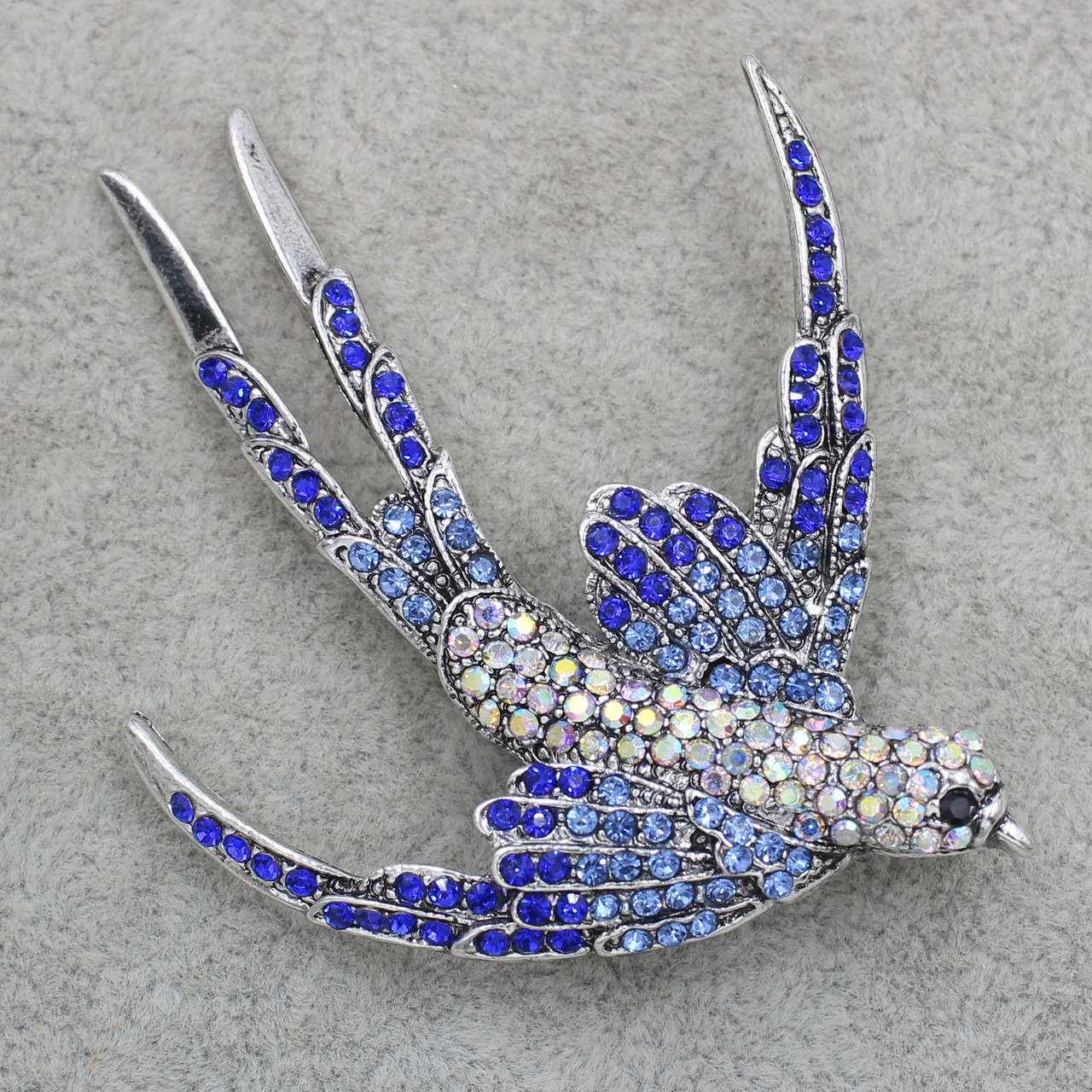 Брошка металева срібляста ластівка з кристалами, що переливаються, розмір виробу 60х55 мм