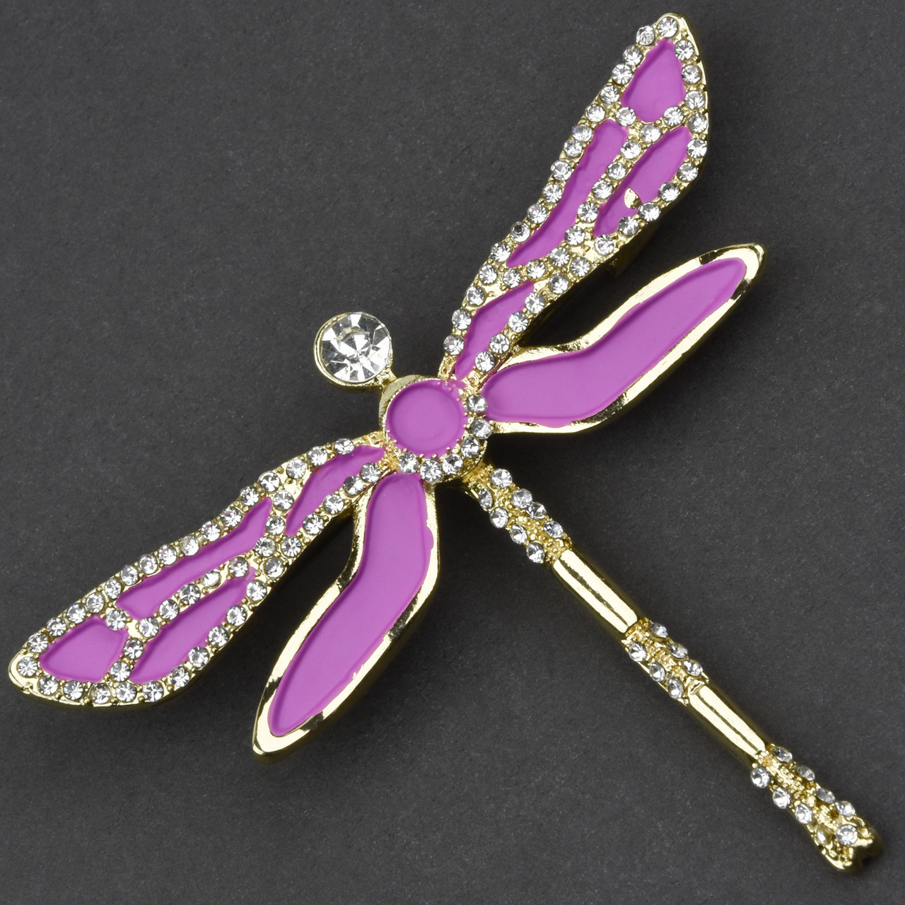 Брошка металева на золотистій основі бабка з білими стразами покрита кольоровою емаллю розмір 50х60 мм