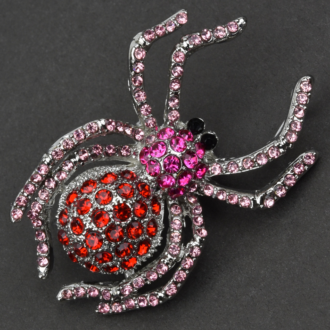 Брошка металева на сріблястій основі павук із різнокольоровими кришталевими камінчиками розмір 50х30 мм