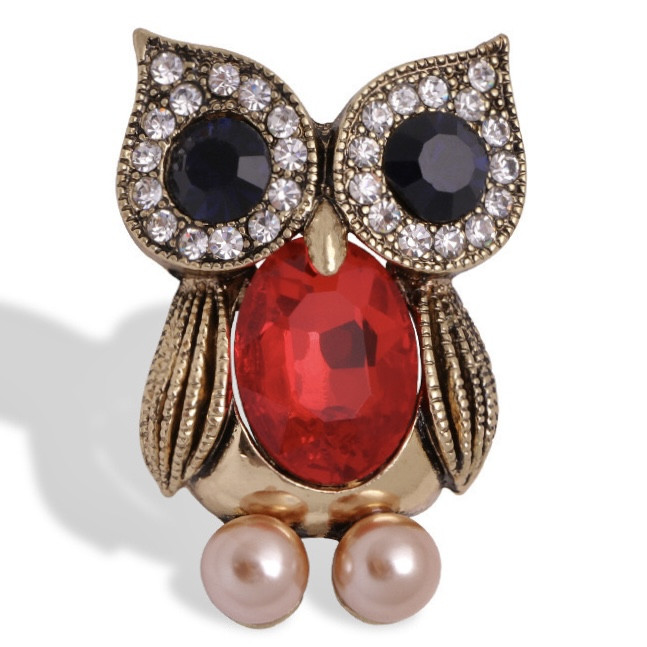 Брошка металева на золотистій основі сова з червоними та чорними стразами та намистинами розмір 45х30 мм
