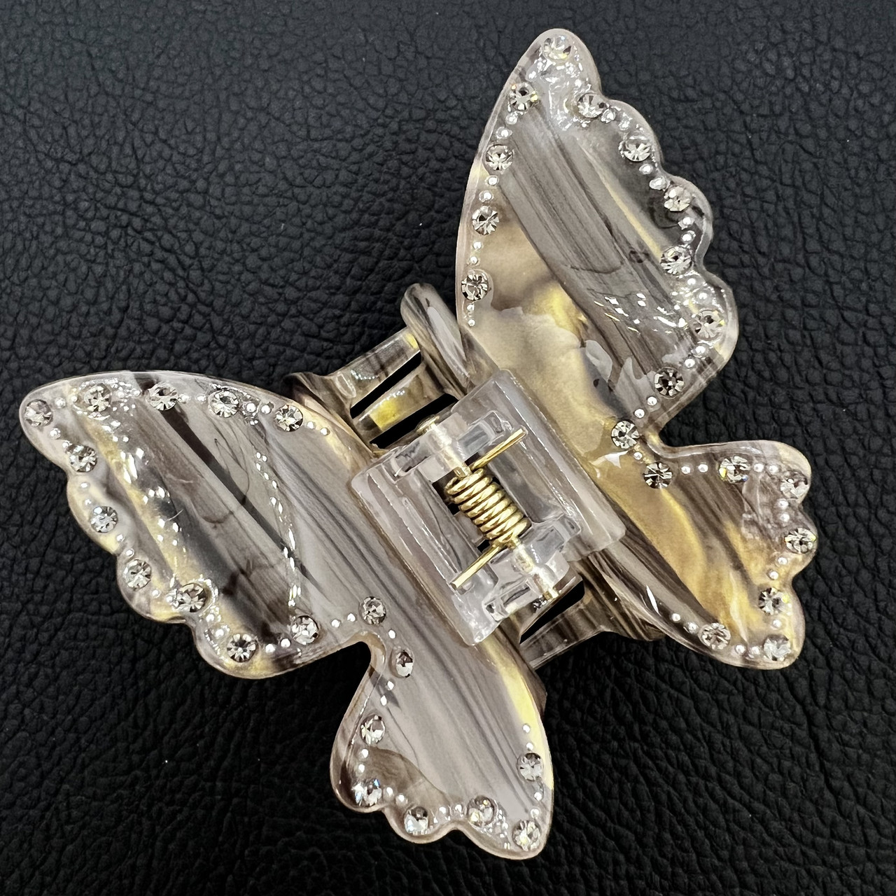 Краб для волосся французький пластик сірого кольору з візерунками метелик із сірими стразами розмір 6.5 см висота 6.5 см