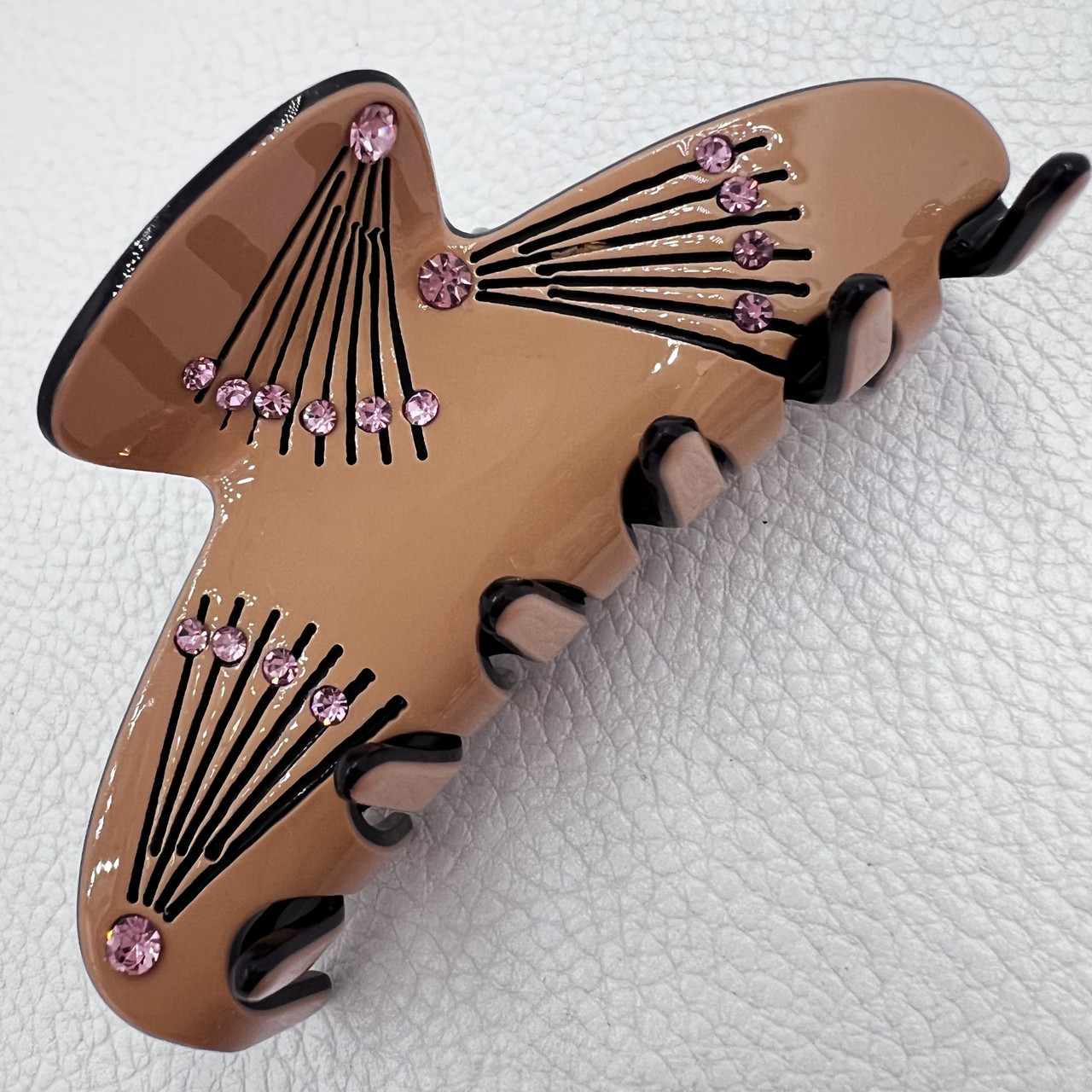 Краб для волосся французький пластик глянсовий персикового кольору з візерунками та стразами ширина 3 см довжина 8.5 см