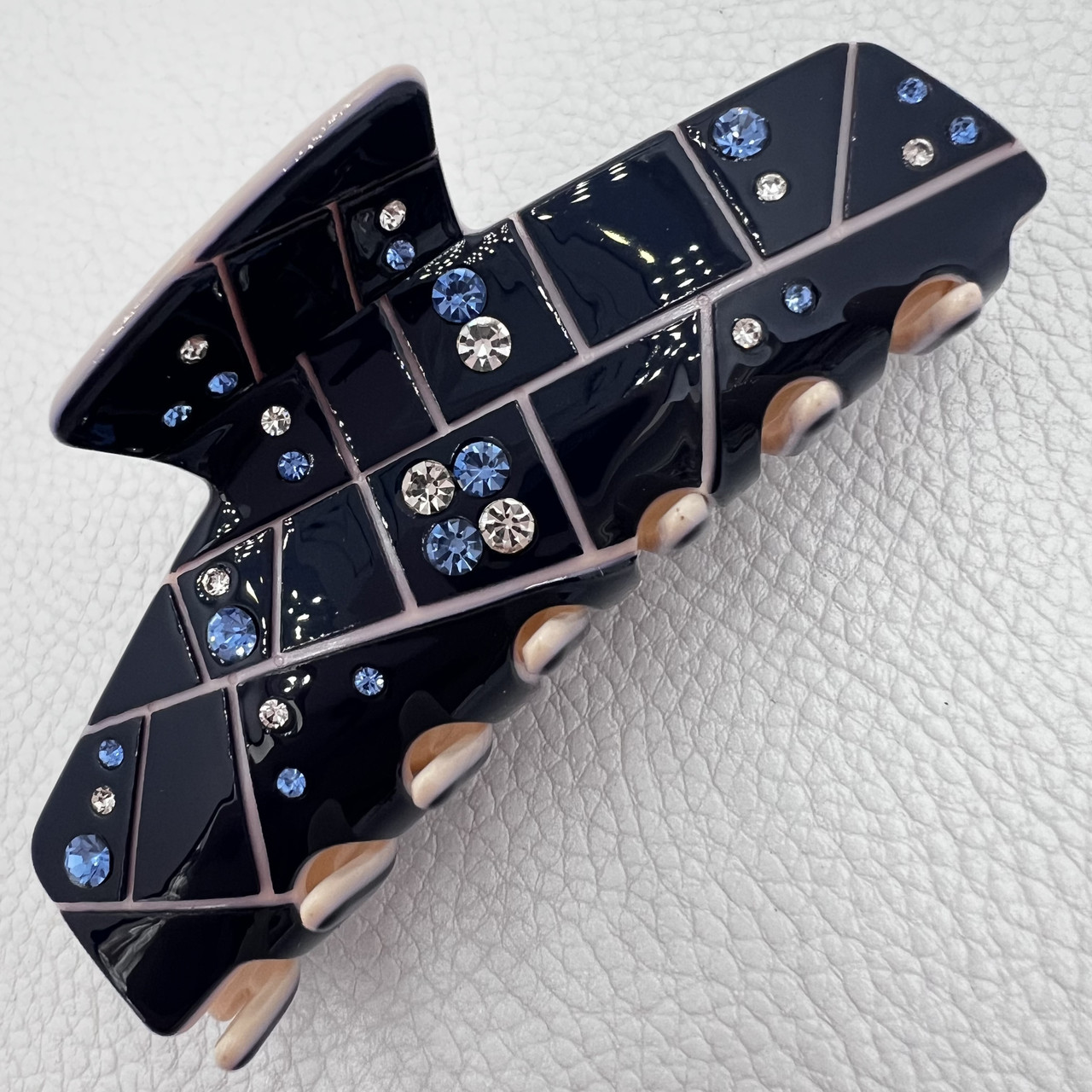 Краб для волосся міцний пластик глянсовий синього кольору з візерунками та стразами, що переливаються, ширина 3.5 см довжина 9 см