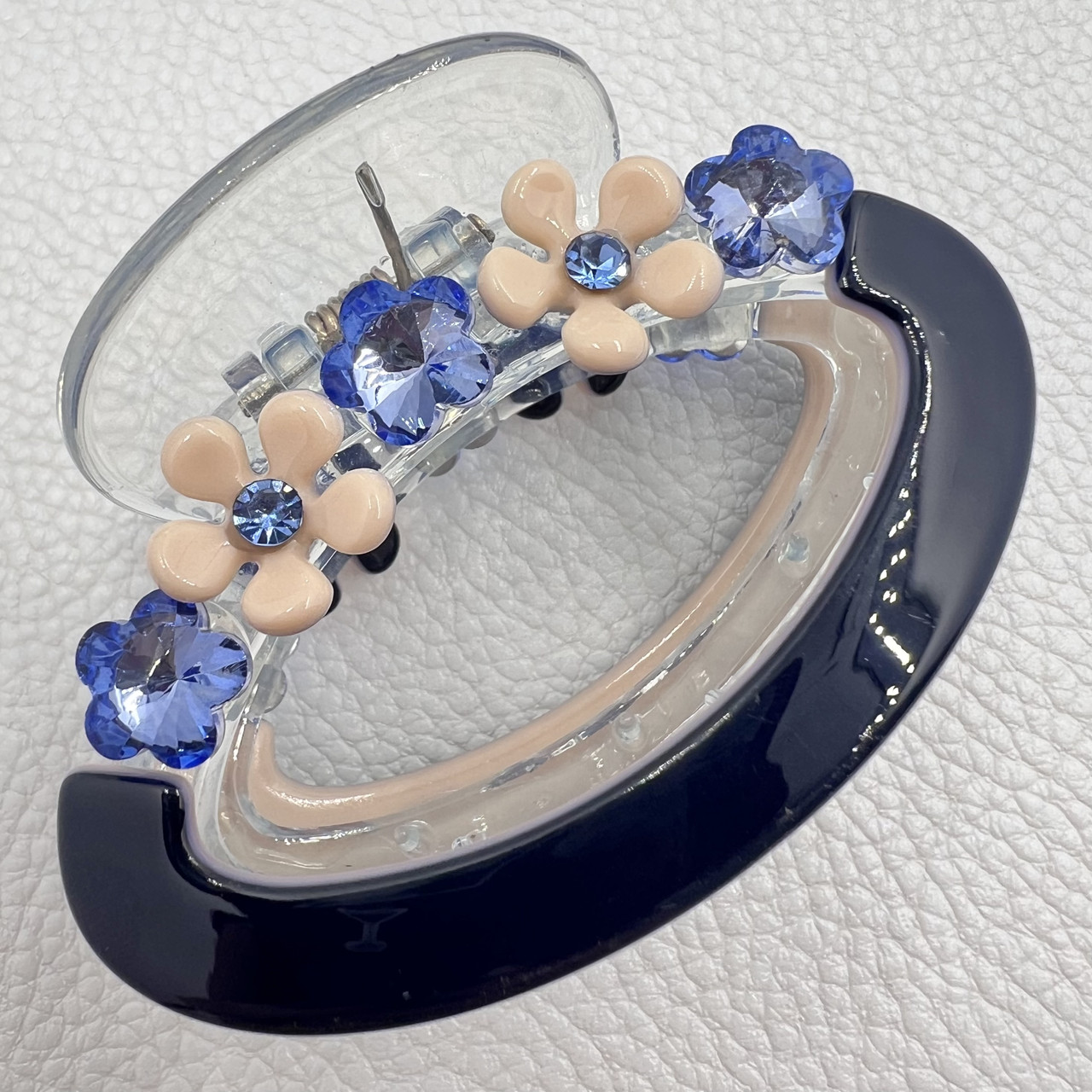 Краб для волосся міцний пластик овальний глянсовий синього кольору з квіточками та блакитними стразами розмір 4.5х7 см